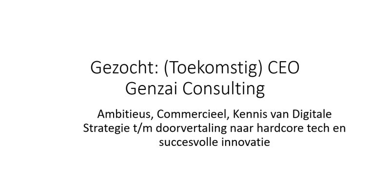 In de laatste paar jaren is Genzai (Ventures) (en zuster fintechbedrijf Boosting Alpha) uitgegroeid tot één van de meest ervaren A.I. clubs in Europa met veel live A.I. implementaties in samenwerking met haar start-ups. Al deze kennis en case studies willen we nu gaan leveragen richting de commerciële markt met de oprichting van Genzai Consulting. Dit is een samenwerking tussen Genzai Ventures, BlueHub (sales, marketing, innovatie bureau) en een ervaren ICT sales lead. Voor Genzai Consulting zoeken we nu een (toekomstig) CEO en tevens overige teamleden.